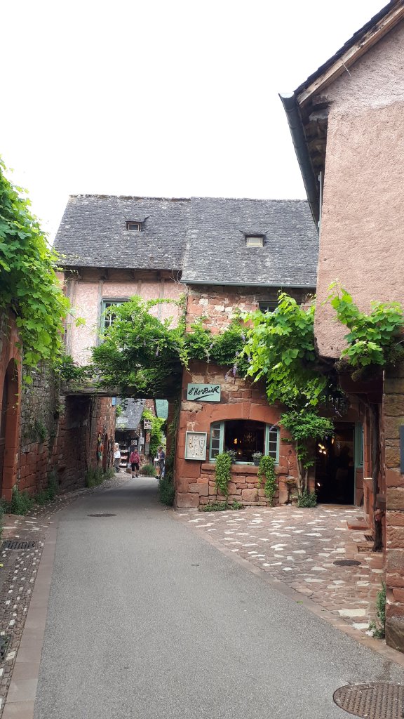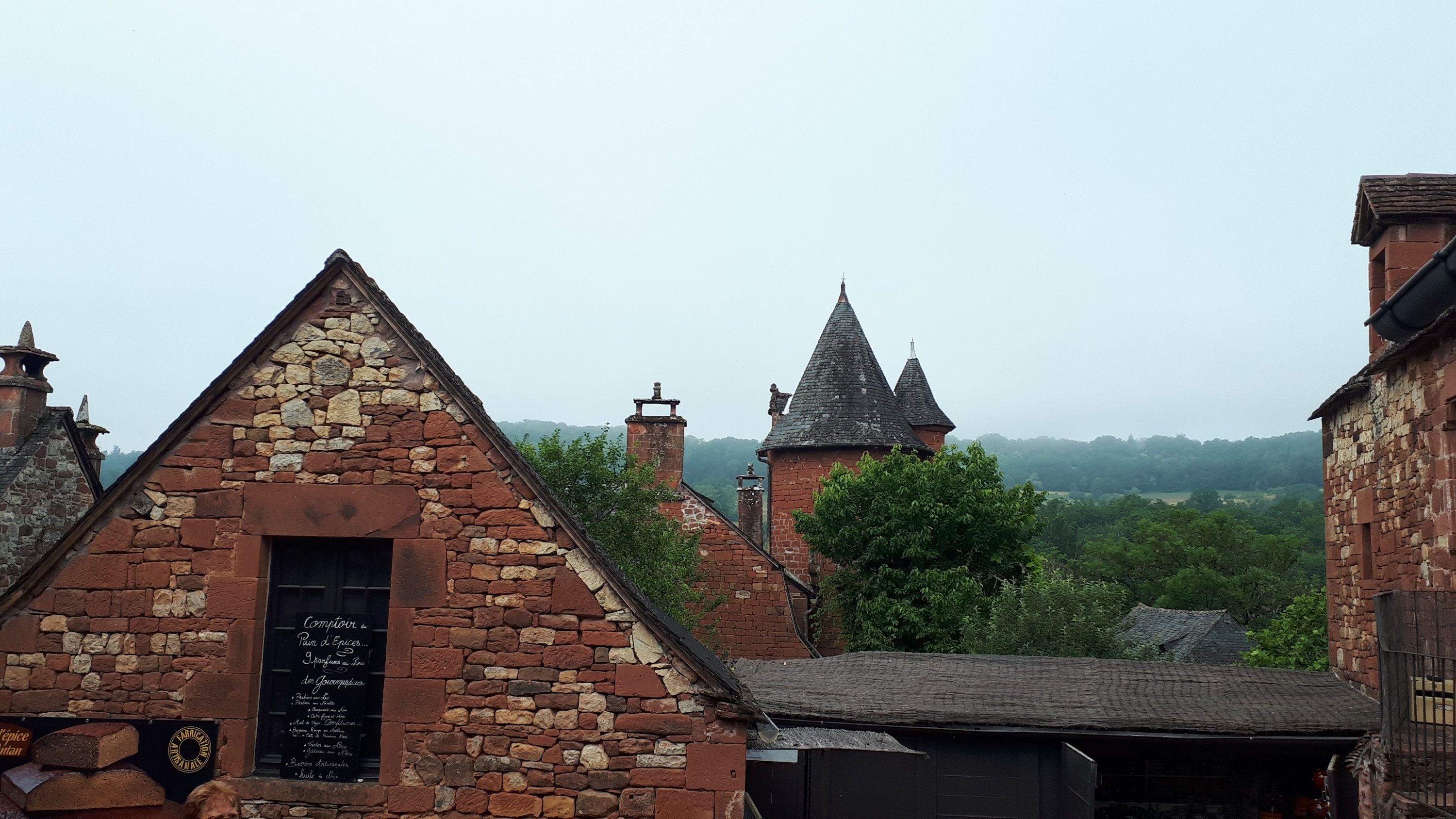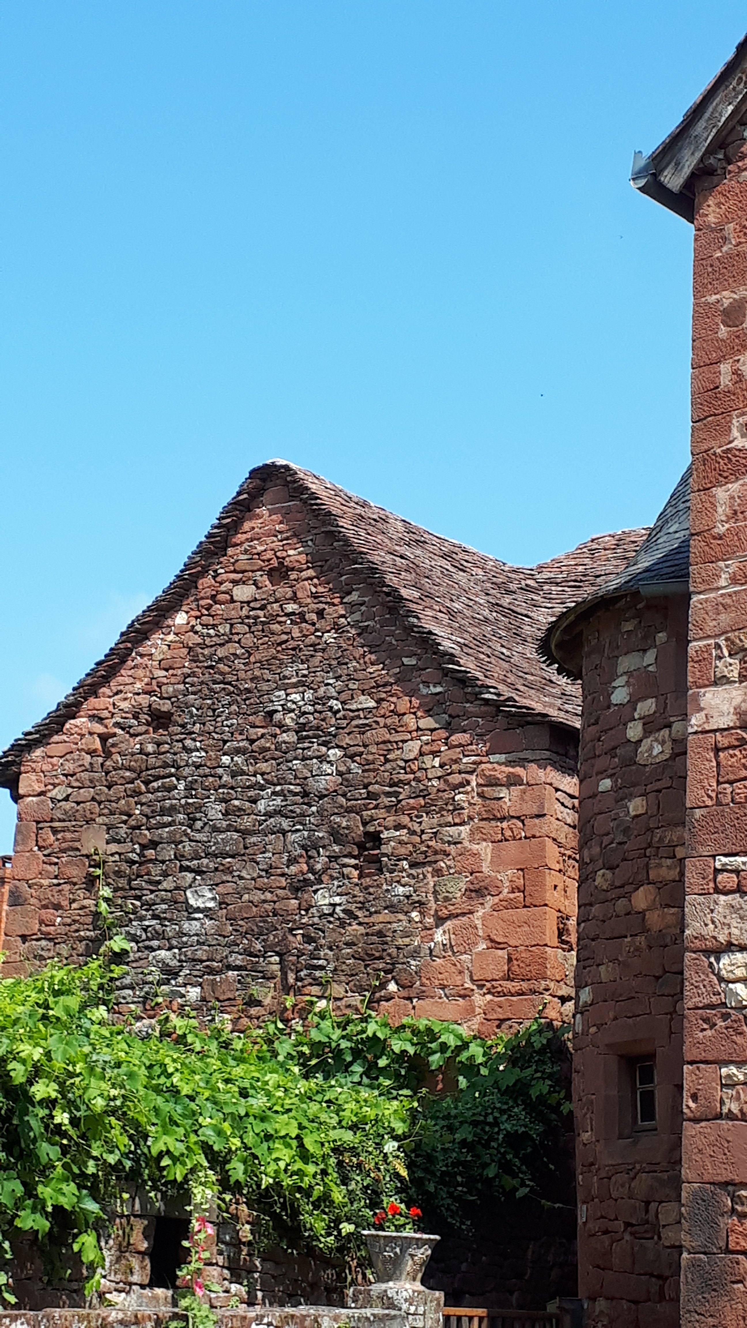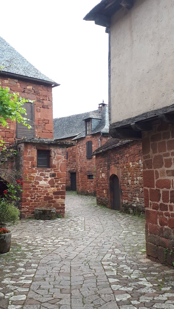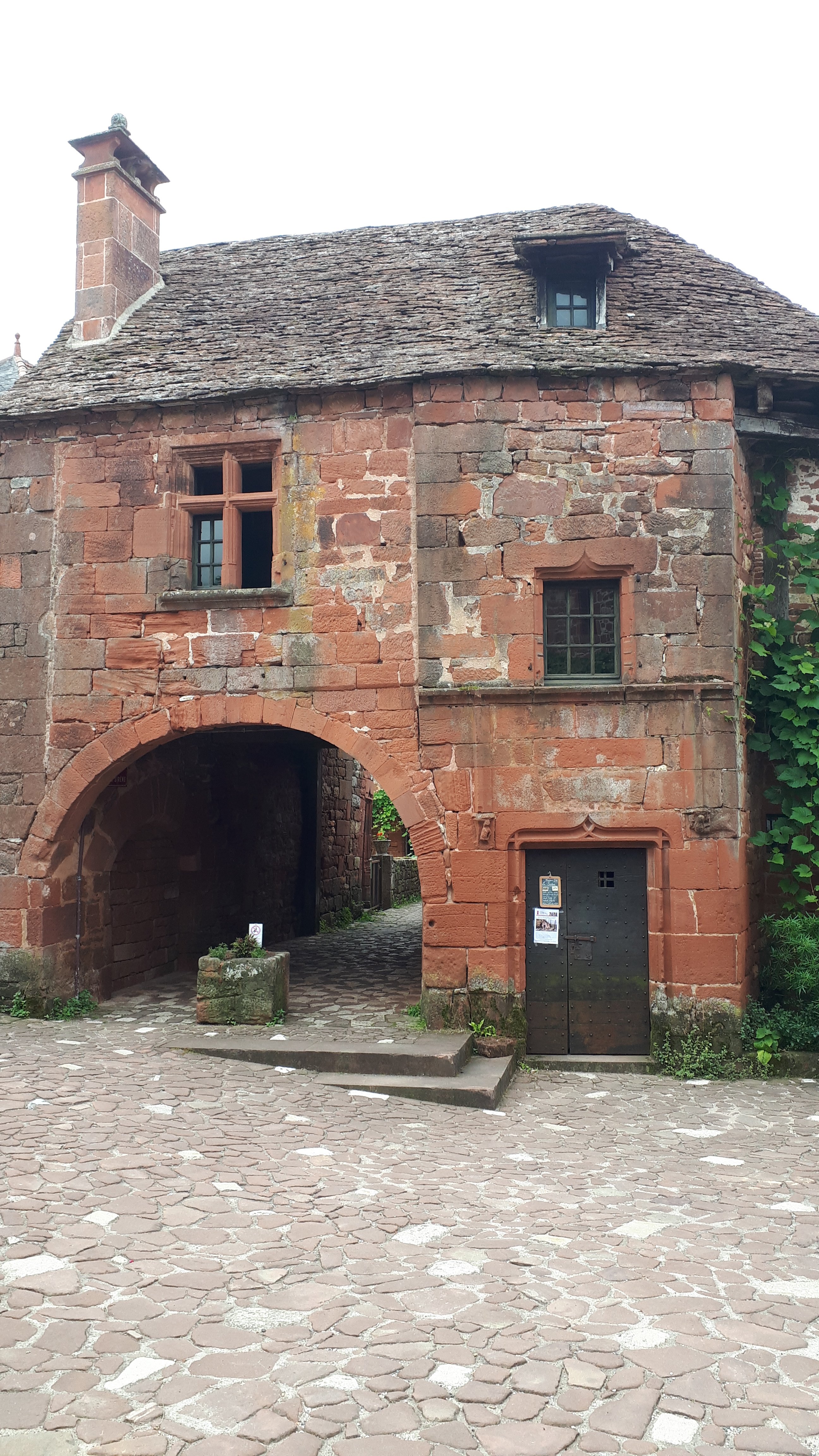 Au milieu des collines verdoyantes couvertes de noyers et de châtaigniers, émerge soudain la silhouette de ce petit village de grès rouge. (Ce grès rouge est dû à l’oxyde de fer contenu dans la pierre).