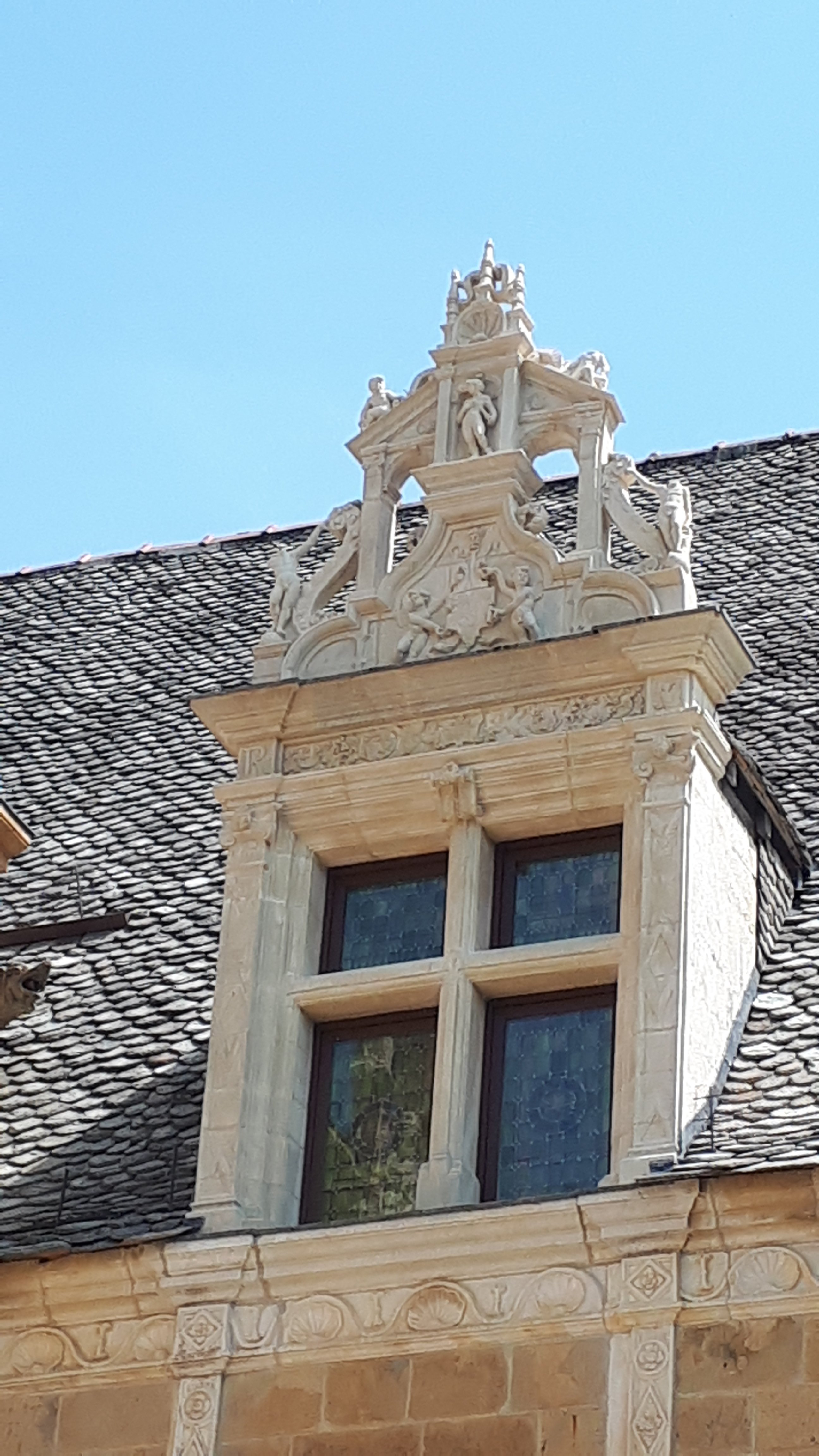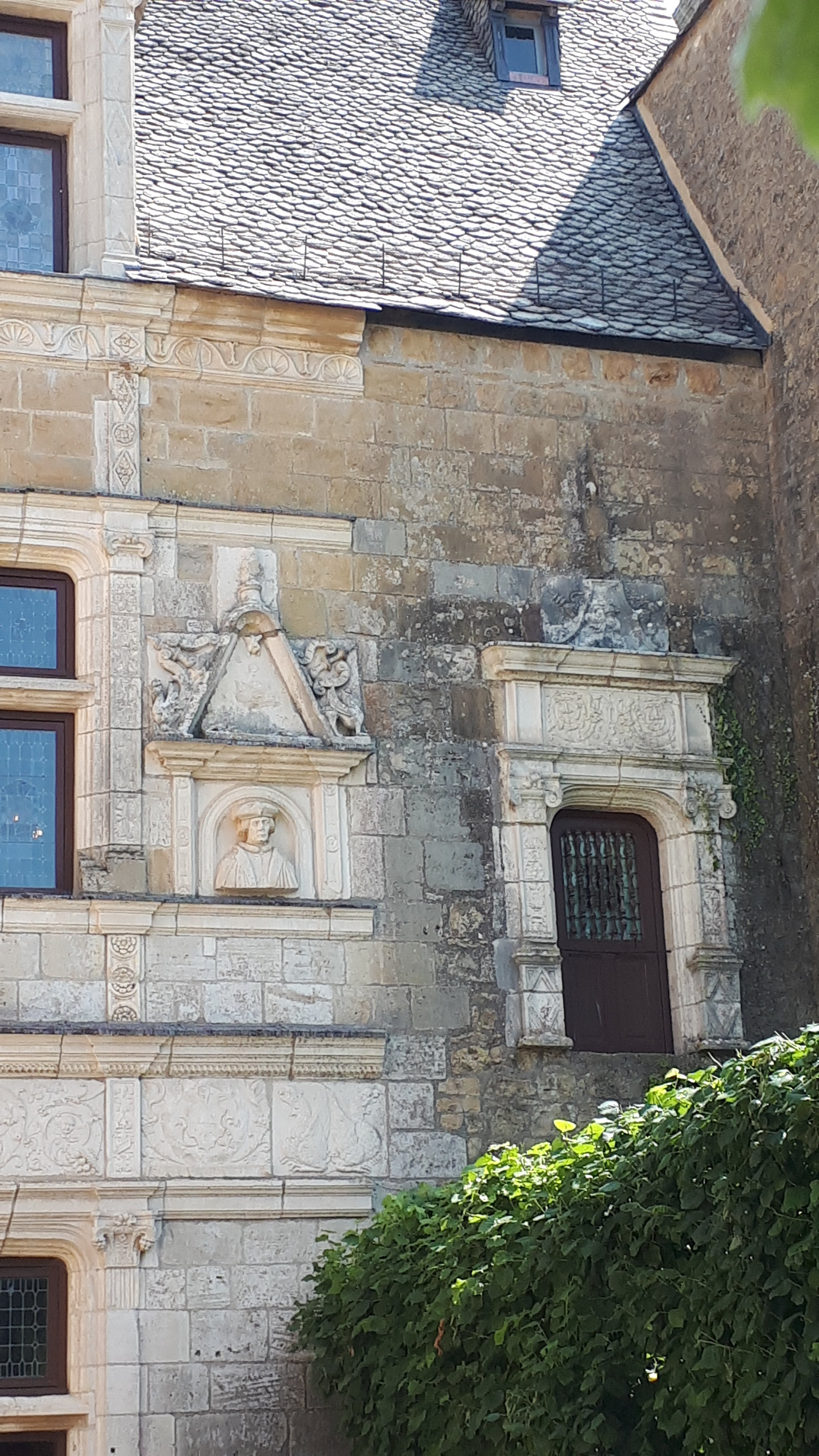 Plusieurs lucarnes meunières (à l’aplomb du mur), de style Renaissance italienne décorent une cour en L qui donne sur des jardins de buis cachés par un mur.
