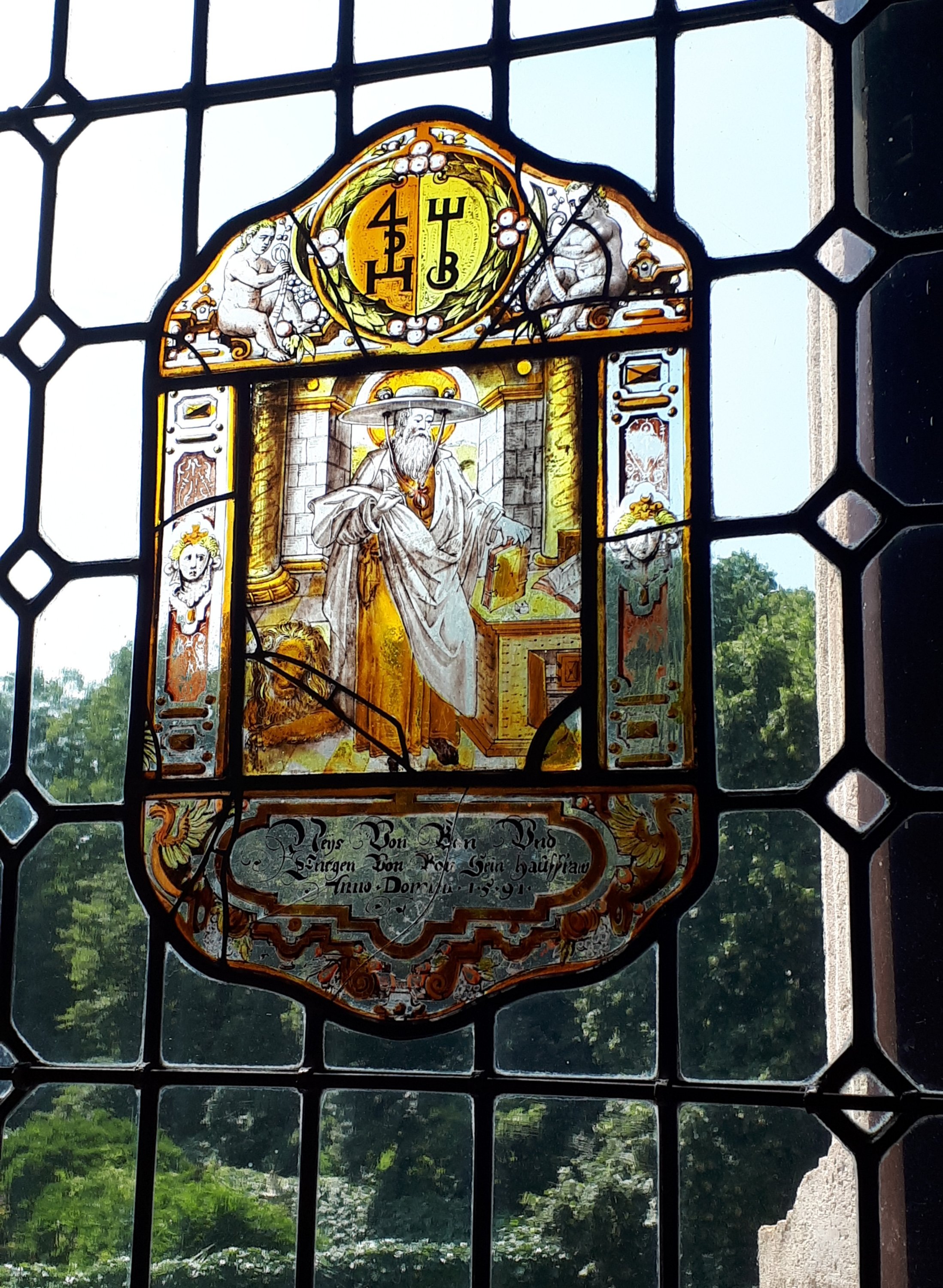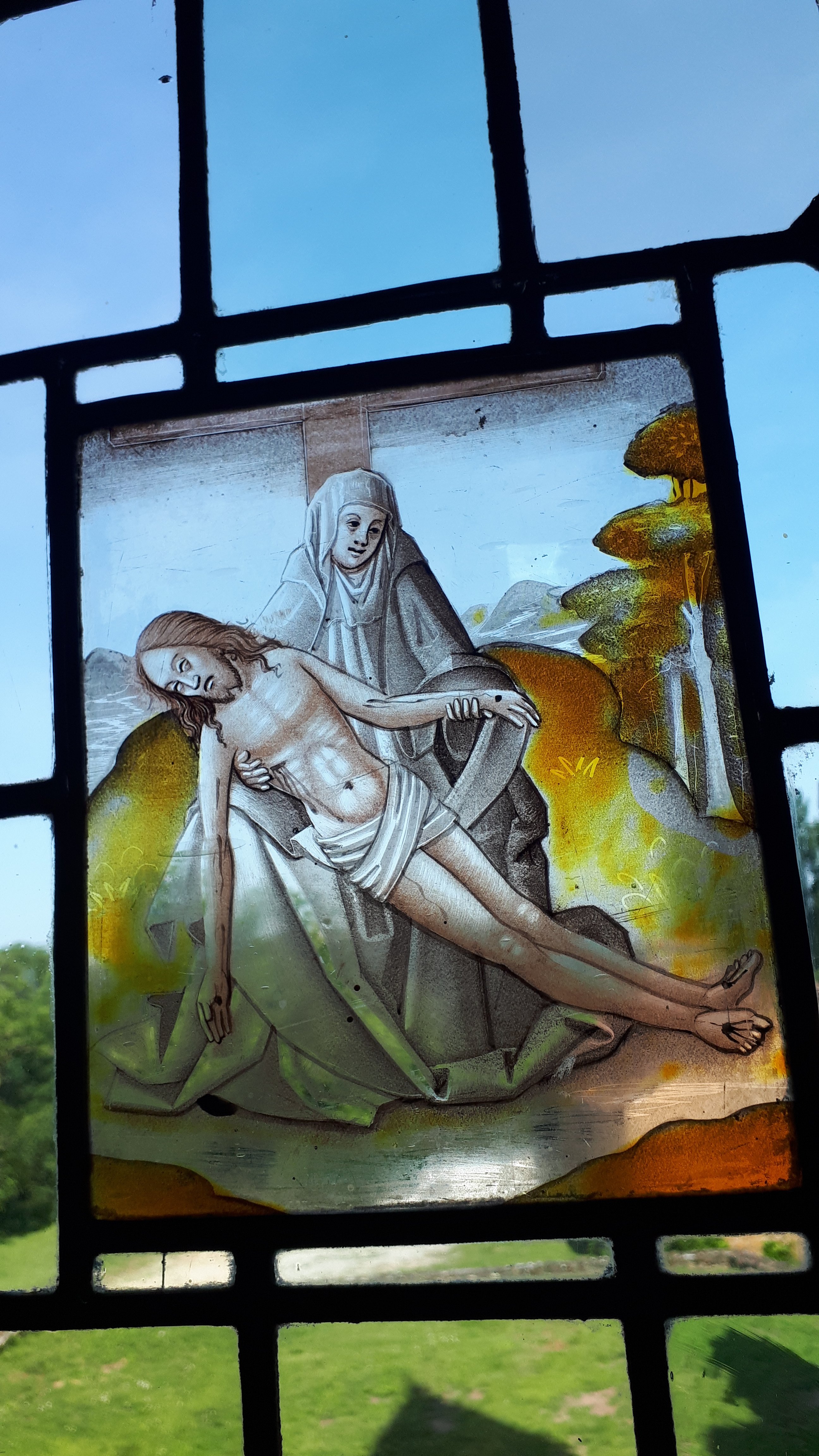 A signaler, dans la plupart des fenêtres à meneaux, des inserts en verres peints qui représentent des scènes de la vie religieuse.