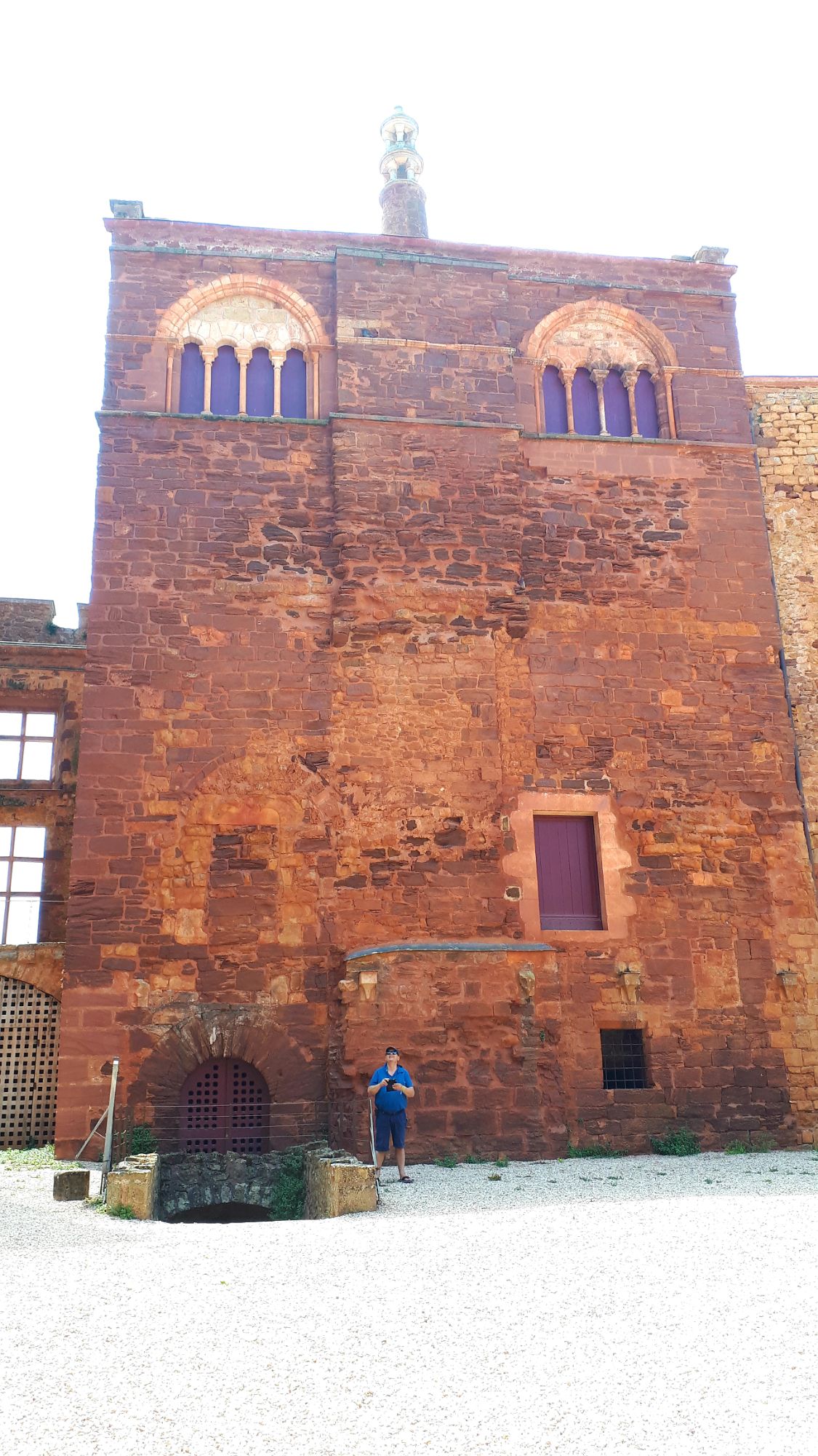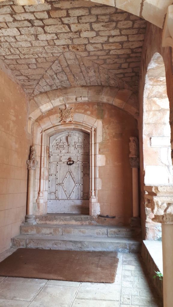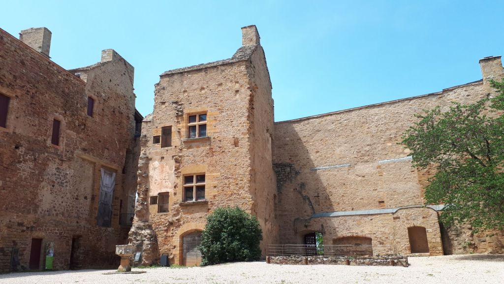 Dans la Cour d’honneur, s’élève la tour résidence, partie la plus ancienne, bâtie en pierre rouge comme à Collonges-la-rouge (19) Cf article. D’élégantes ouvertures romanes à colonnettes signalent l’aula (grande salle) aux étages supérieurs (qui ne faisaient pas partie de la visite malheureusement).